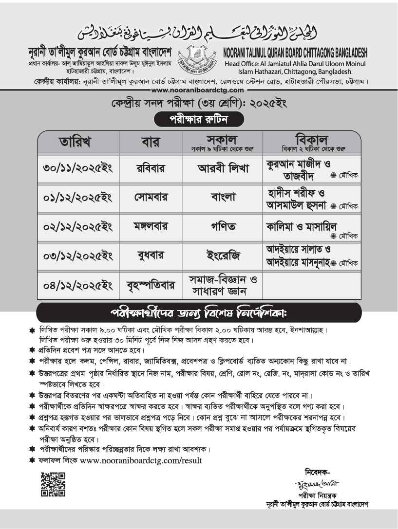 কুরআন বোর্ড চট্টগ্রাম নূরানী তা'লীমুল বাংলাদেশ মাদ্রাসা শিক্ষা বোর্ড বেফাকুল মাদারিসিল আরাবিয়া বাংলাদেশ। বিঃ দ্রঃ এতিম, গরিব ও মেধাবী ছাত্র-ছাত্রীদের জন্য বাংলাদেশ মাদ্রাসা শিক্ষা বোর্ড কর্তৃক উপবৃত্তির ব্যবস্থা। |
